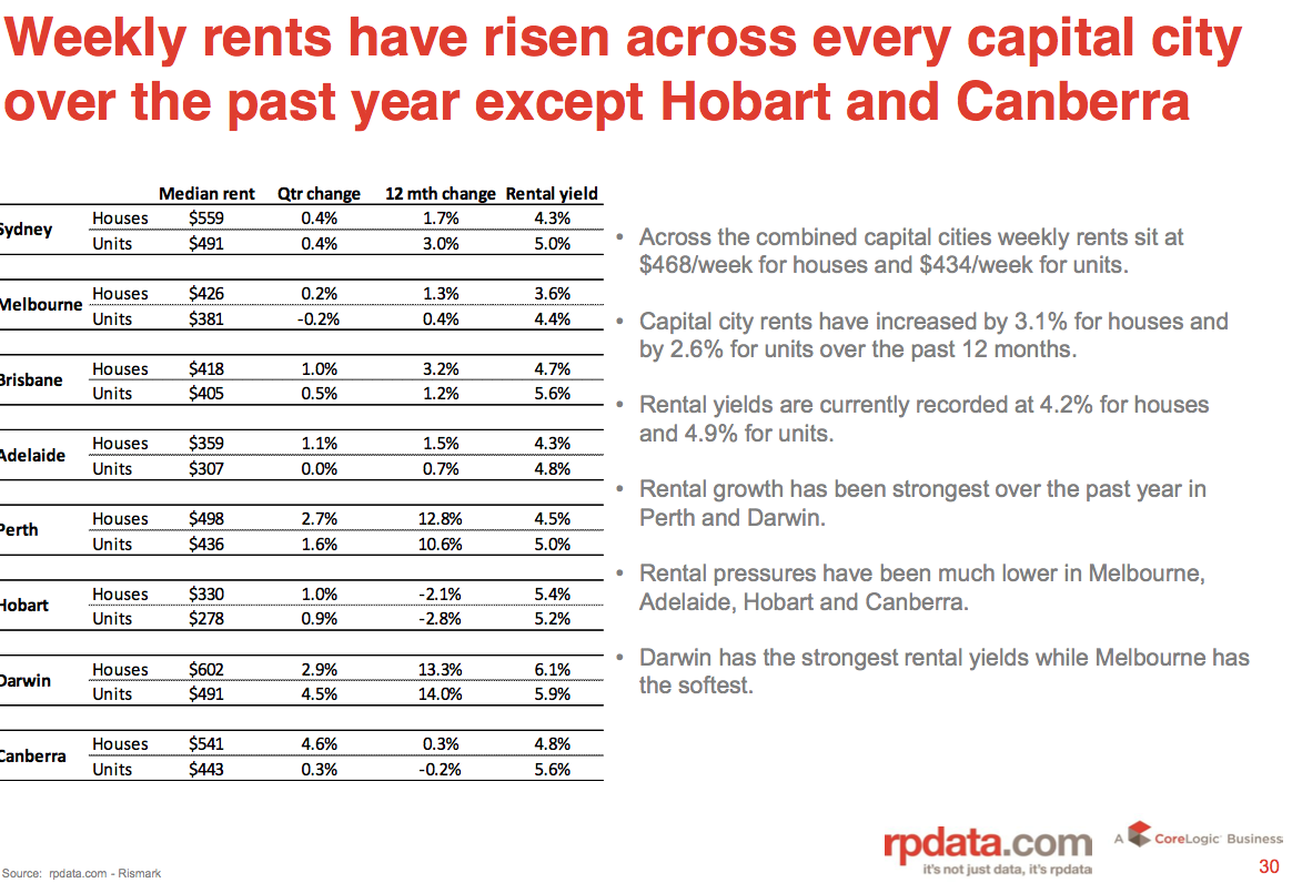 - Highest rental yields: Darwin houses with gross rental yield of 6.1 per cent and Darwin Units at 5.9 per cent