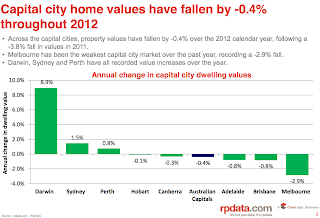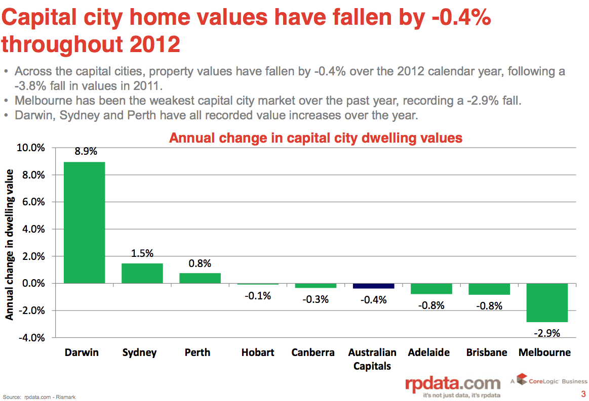 Capital city home values fall over consecutive years, down -3.8% in 2011 and -0.4% in 2012. With capital city dwelling values falling by -0.3% over the month of December, home values recorded an aggregate decline of -0.4% over the 2012 calendar year.